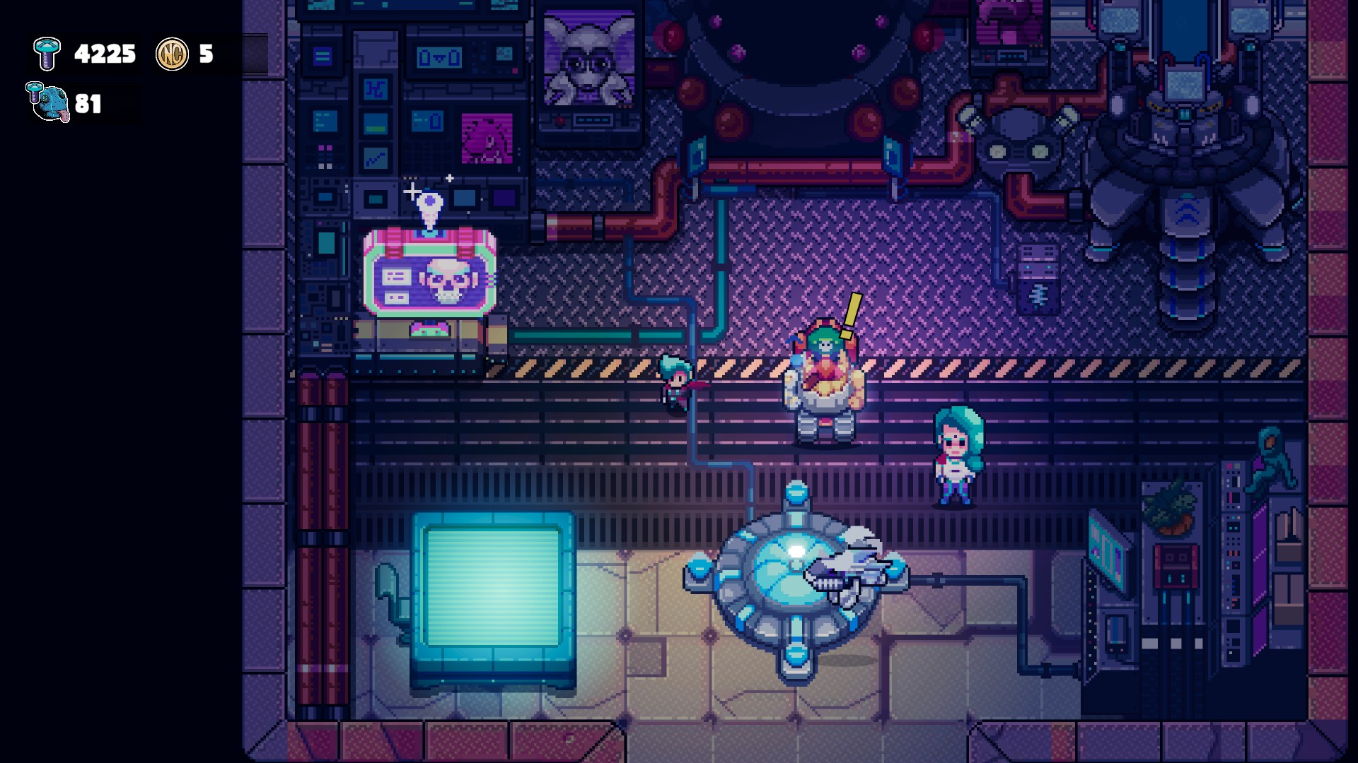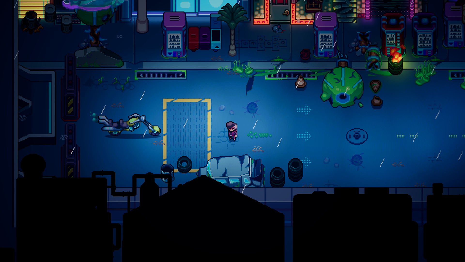 - Desde o começo, o estilo gráfico em pixel art chama a atenção. A ambientação cyberpunk — que, aliás, é um subgênero que eu curto demais — cria uma identidade forte para o game;