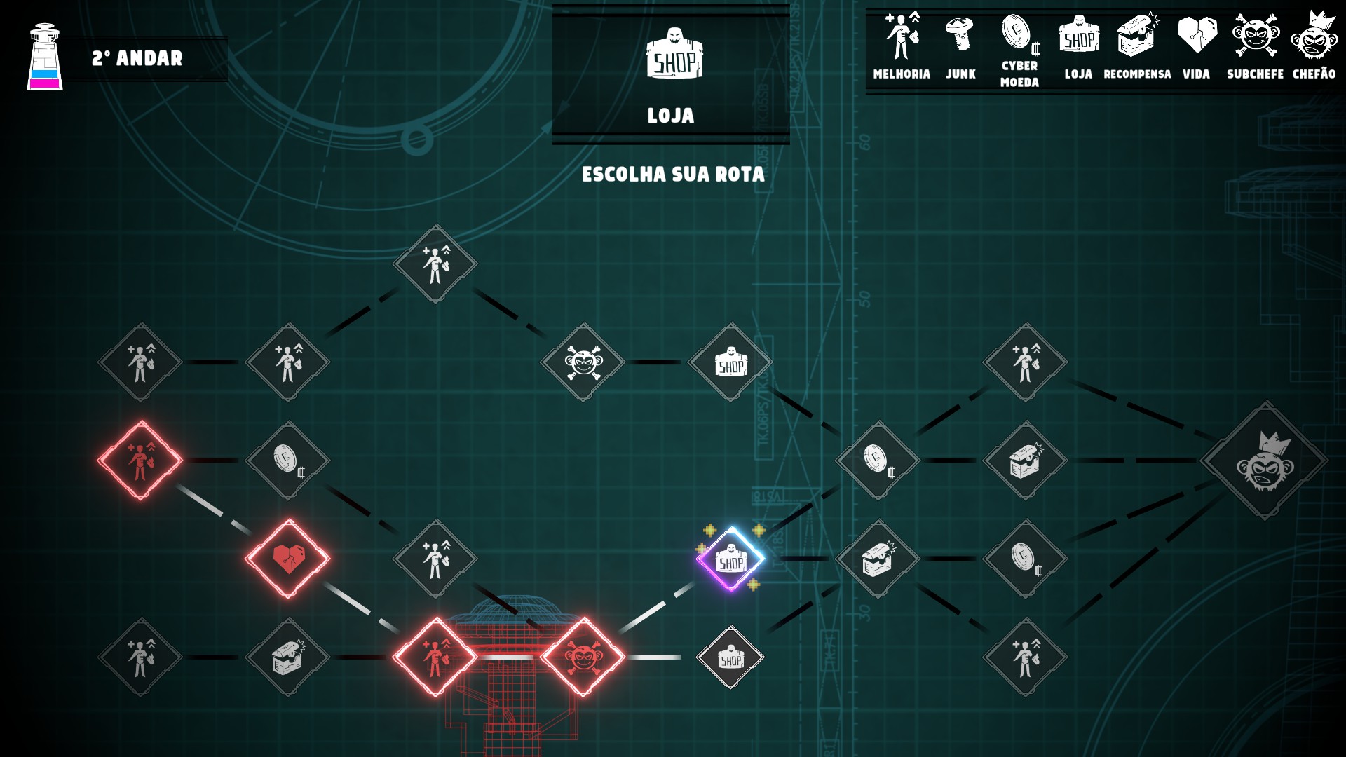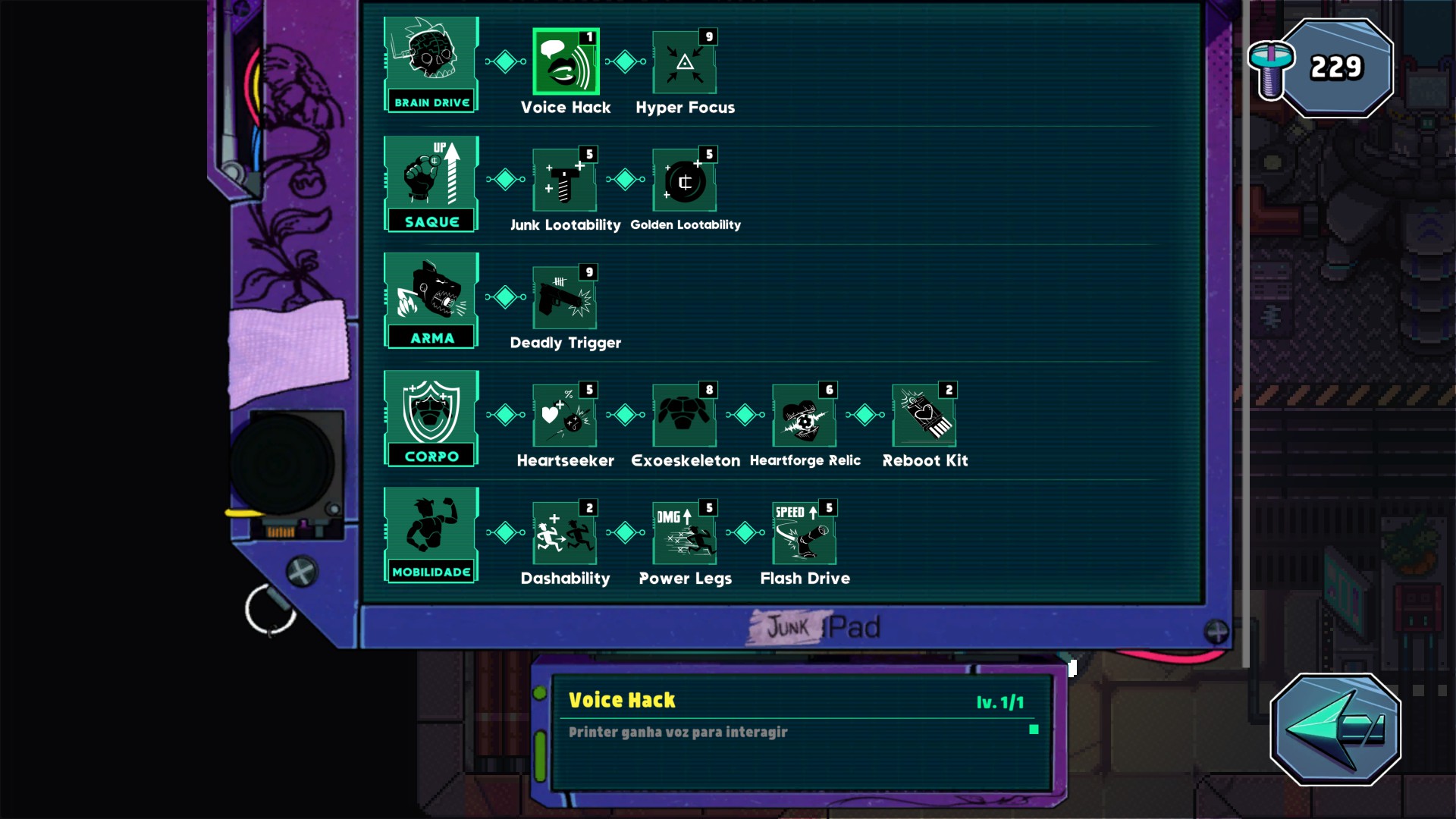 - Junks, que são recursos usados para fazer melhorias permanentes no personagem;